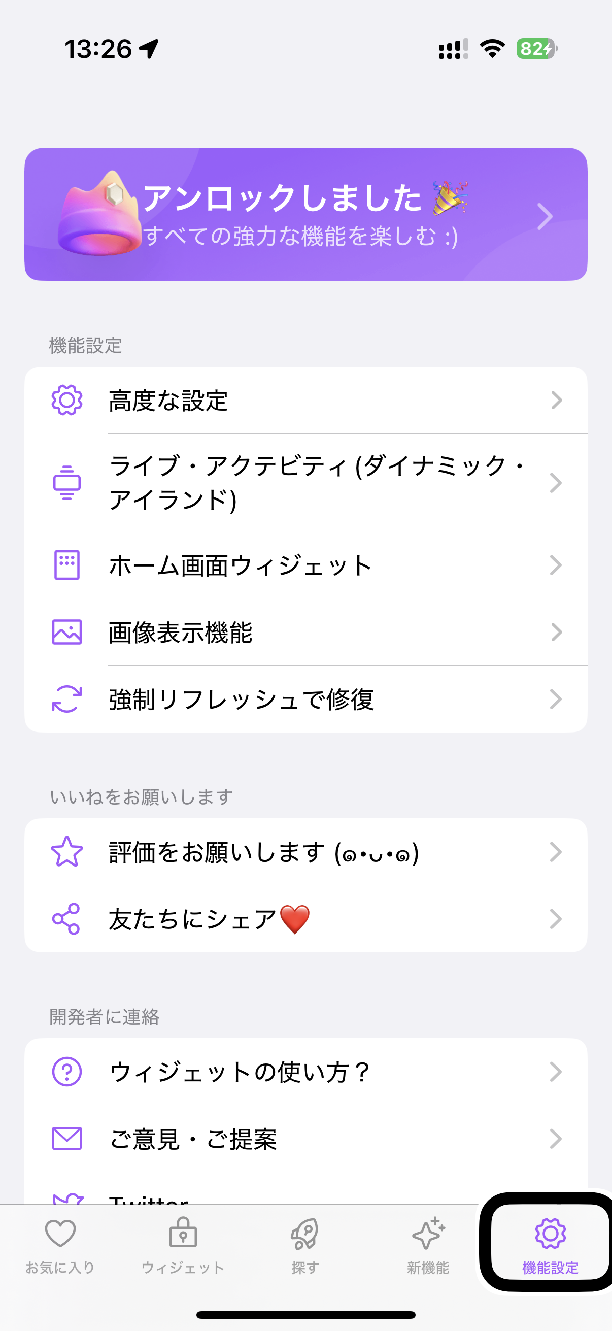 - 上記ダウンロードリンクからアプリを入手・起動後、「ウィジェット」タブを開きます。